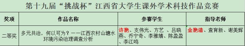 6月8日,第十九届“挑战杯”江西省大学生课外学术科技作品竞赛终审决赛在东华理工大学(南昌校区)圆满落幕。太阳集团官网金艳清等老师指导的学生团队在此次竞赛中表现出色,经过层层激烈角逐,最终荣获二等奖。