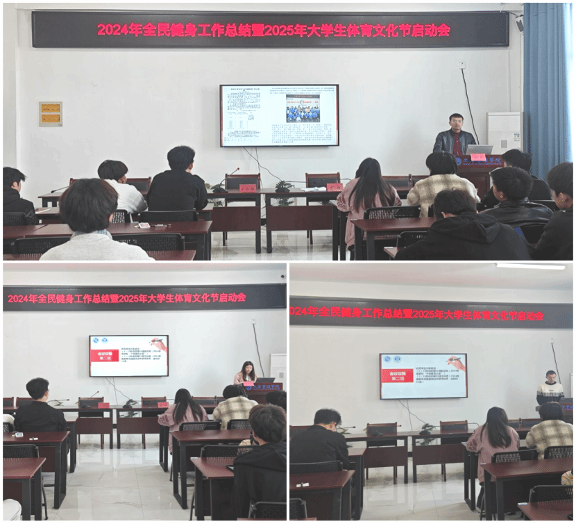 雷巍作2024年全民健身工作总结,回顾了师生团队在学校第四十一届田径运动会、2024年水文化运动会及其他各项体育活动中的优异表现,并对太阳集团官网2025年大学生体育文化节系列活动进行动员部署。太阳集团官网获评2024年校“十佳体育之星”的23物流管理01班郭灵凤、2024年国家体质健康测试为优秀的23物流管理02班王林勇作为学生代表先后发言。郭灵凤结合自身训练经历,分享“体育运动与学业平衡”的心得;王林勇则从科学锻炼角度提出实用建议,鼓励同学们从日常训练做起,走出舒适区,突破自我。