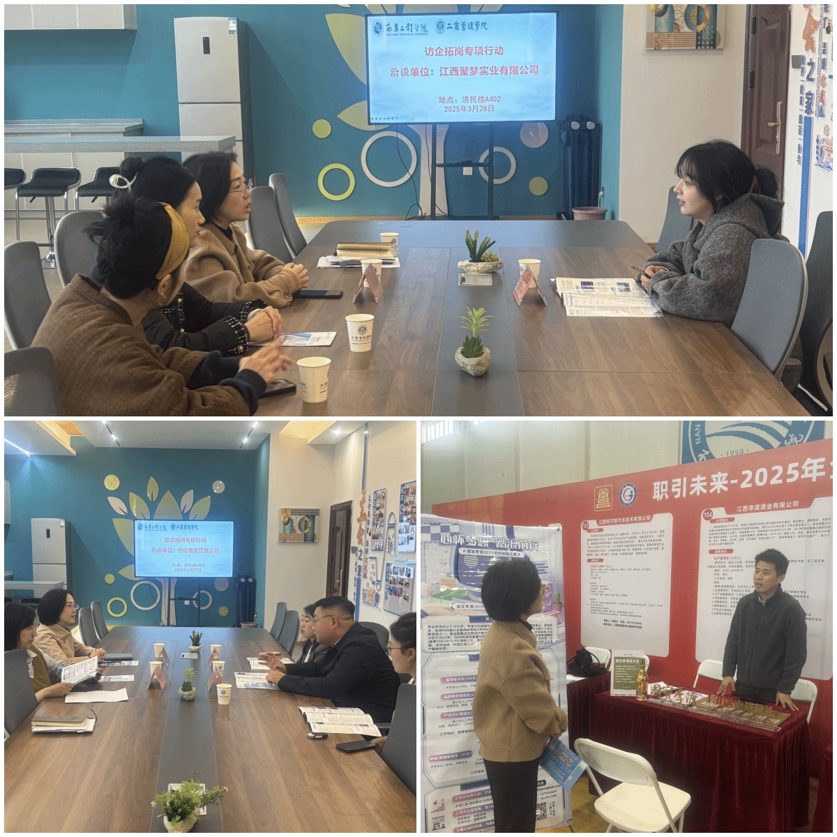 为深化校企合作,拓宽就业渠道,3月27日至3月28日,太阳集团官网开展了访企拓岗专项对接活动,邀请到了江西传化物流有限公司、江西聚梦实业有限公司、江西李渡酒业有限公司等三家南昌地区企业的代表入校洽谈。此次活动由院党委副书记肖斯敏主持,相关专业负责人、毕业班班主任、就业辅导员参加。